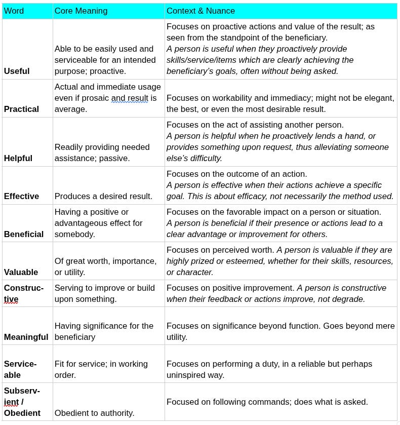 We can answer that by comparing it with various synonyms used when describing or explaining the concept of “useful”: practical, helpful, effective, beneficial, valuable, constructive, meaningful, serviceable, subservient/obedient.